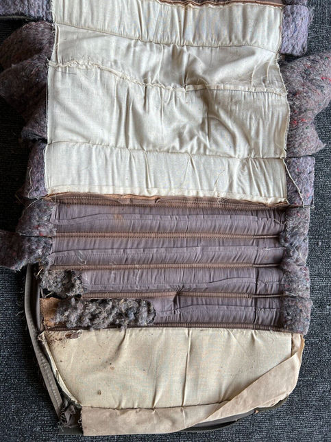 Pictured is a genuine OEM Mercedes leather rear bench seat cover for the bottom of a W111 rear seat. The cover may also be used for a W109 and matches the cognac color of two front seat backs on the "All Other Vehicles" page. The cover is a cognac brown color and has some damage. A small portion of the seat has a hole which runs through from the front into the back. Both the leather front and the rear liner is damaged. As the leather cover is very large, it can be repaired using matching pieces from the edges, or the material can be used to reproduce a driver or passenger front seat.